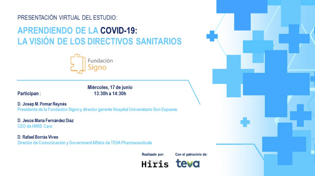 El 17 de junio presentaremos junto a la @fundacionsigno y @tevapharmeurope el Estudio «Aprendiendo de la COVID-19», realizado para dar a conocer la respuesta del sistema sanitario al Covid-19, a través de la experiencia y reflexión de los Directivos Sanitarios #DirSanidadCovid19.
